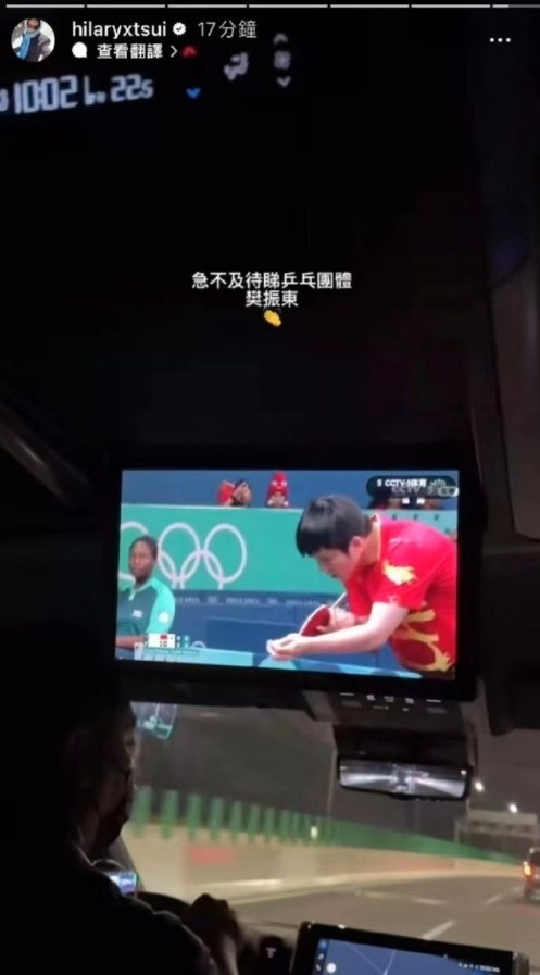徐濠萦在ins上晒出了当时车里看比赛的照片,并配文“迫不及待睇(粤语看的意思)乒乓团体樊振东”。