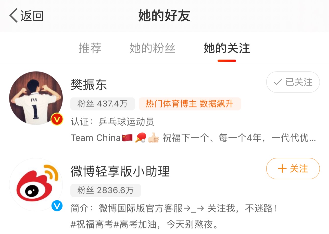 早田希娜入驻微博后迅速关注了樊振东,樊振东也回关了早田希娜。