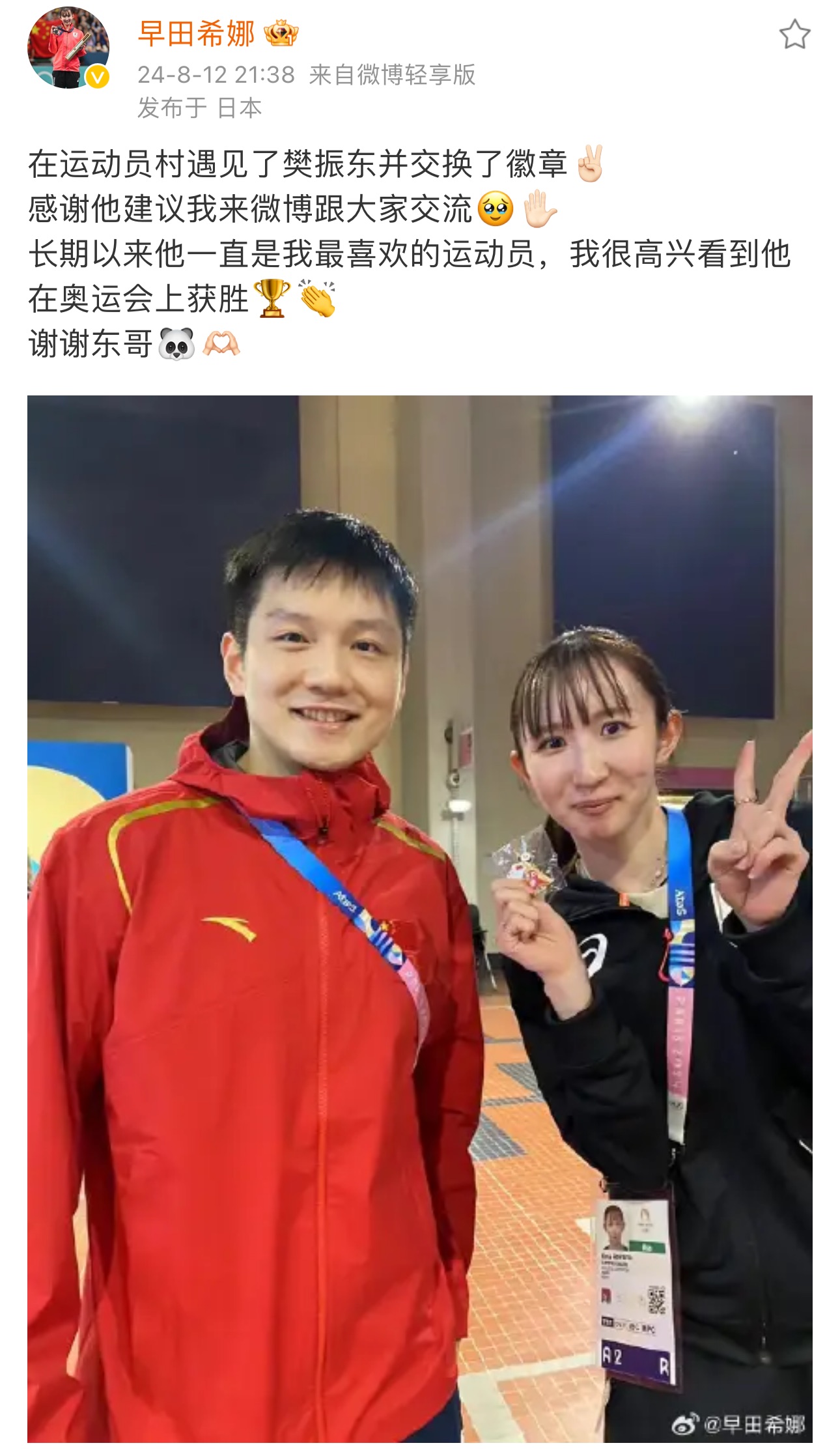 早田希娜发帖晒出与樊振东的合影,两人在奥运村交换了pin(奥运徽章),她表示是樊振东建议她来微博,并表示樊振东一直是她最喜欢的运动员。