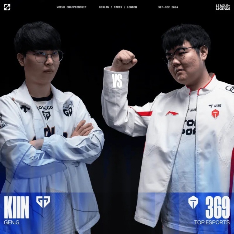 直播吧10月4日讯 2024英雄联盟全球总决赛GEN对阵TES的比赛正在进行,LOL官推分享Kiin与369海报,并配文:Kiin对战369,两位世界顶级上单之间即将上演史诗级的对决!
