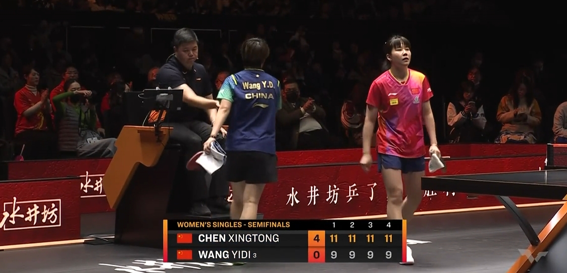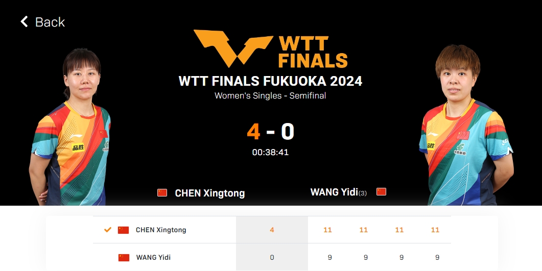 最终,陈幸同4-0横扫王艺迪晋级决赛,四局比分均为11-9。陈幸同将与世界第2王曼昱争夺女单冠军,决赛将于北京时间11月24日16:00进行。