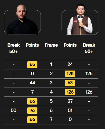第一局布雷切尔65-24拿下;第二局丁俊晖通过一杆精准的长台上手,轰出单杆125分完成清台;第三局丁俊晖在防守时打进了一杆运气球,随后完成超分,布雷切尔安全球大漏,虽然只被超了一分,依然选择认输,第4局丁俊晖再次轰出单杆126分,大比分3-1领先。