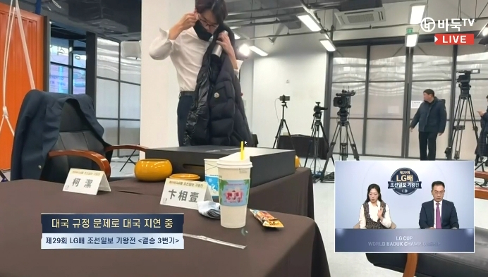 决胜盘比赛途中,柯洁将两颗提子放在了棋盒外面,韩国裁判此时暂停比赛,柯洁对裁判中止比赛的时间和方式提出异议,一度起身直接质问裁判“你怎么能这么干呢”。此后比赛中断超过两个小时。
