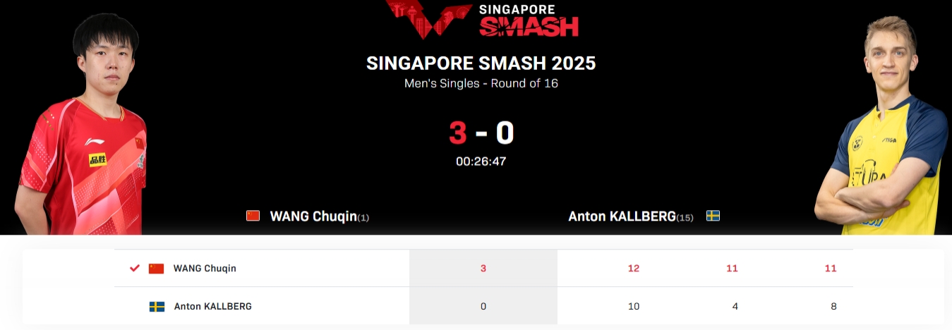 直播吧02月06日讯 2025年WTT新加坡大满贯16强战,王楚钦3-0战胜瑞典选手卡尔伯格,挺进男单8强。