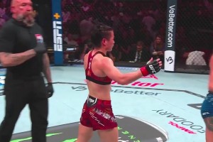 还剩两分钟左右,双方拉开身位,张伟丽重拳击中苏亚雷斯。苏亚雷斯之后又是下潜想抱摔没成功,两人再次僵持。之后进地面战,张伟丽不断砸拳控制局势。