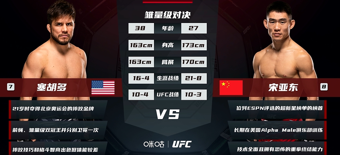 宋亚东现年27岁,生涯战绩21胜8负。亨利-赛胡多现年38岁,生涯战绩16胜4负,奥运会摔跤冠军、UFC前双冠王,2020年退役,之后复出。
