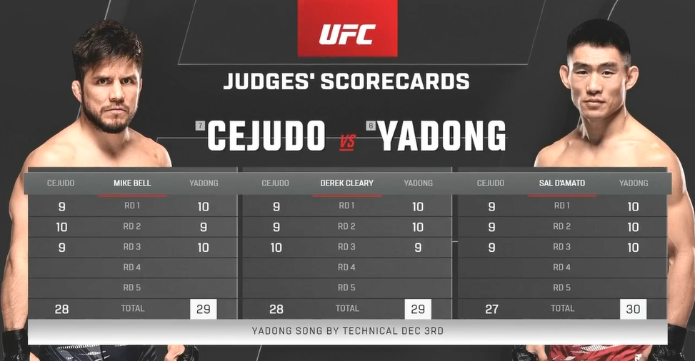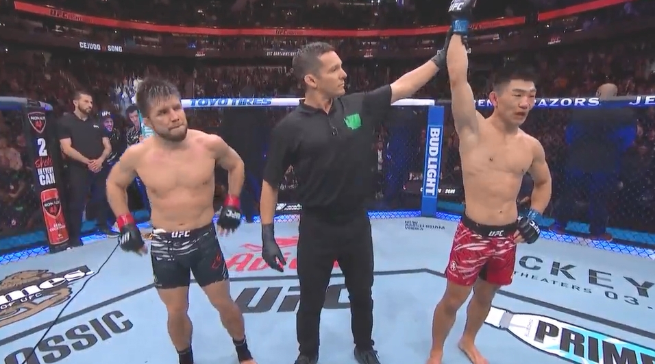 直播吧02月23日讯 UFC西雅图头条主赛,中国选手宋亚东对阵“Triple C”亨利-赛胡多。宋亚东的第四次头条主赛,挑战38岁前冠军赛胡多。最终宋亚东以 (29-28, 29-28, 30-27)技术判定,击败亨利-赛胡多。