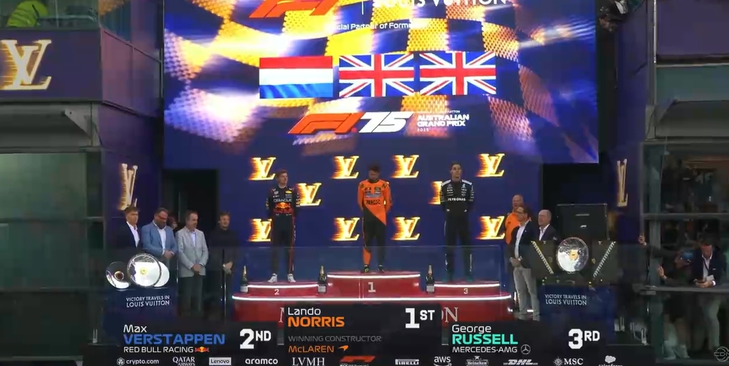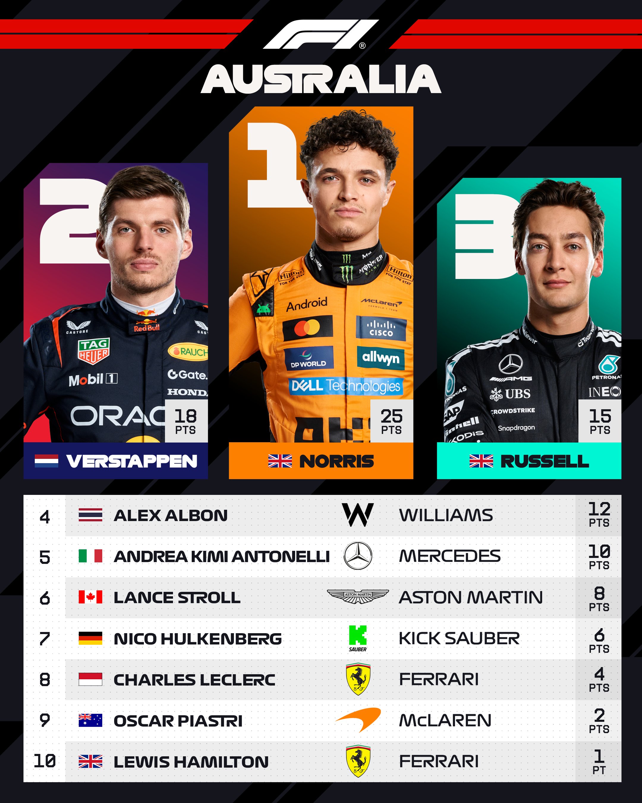 直播吧03月16日讯 2025赛季F1澳大利亚大奖赛正赛今日在阿尔伯特公园赛道进行,最终诺里斯夺冠,维斯塔潘拉塞尔分列二三,阿隆索等6人先后退赛。
