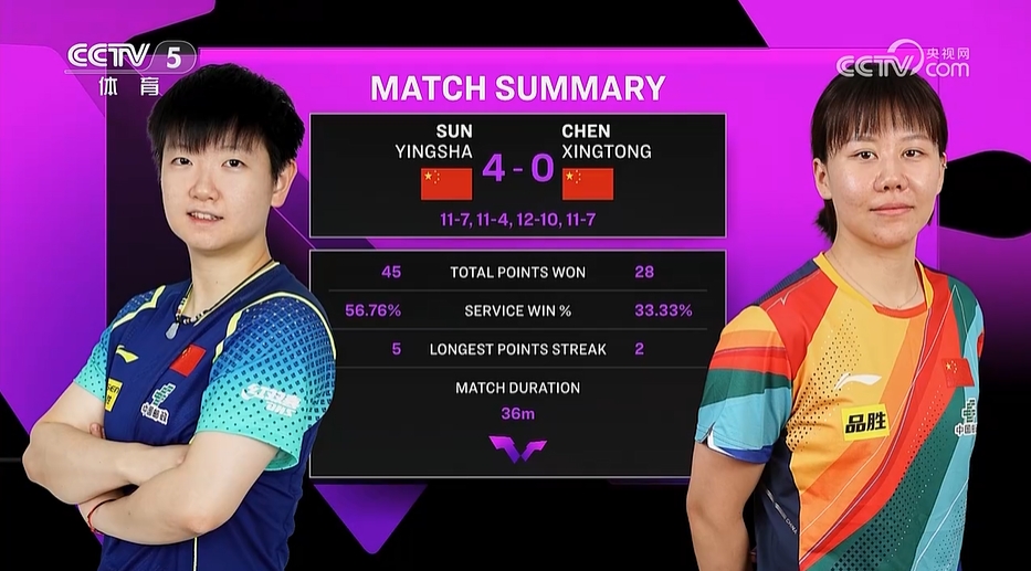 在稍早的半决赛中,孙颖莎让二追四,最终4-2击败王艺迪。陈幸同则是因为王曼昱伤病退赛,得以晋级。