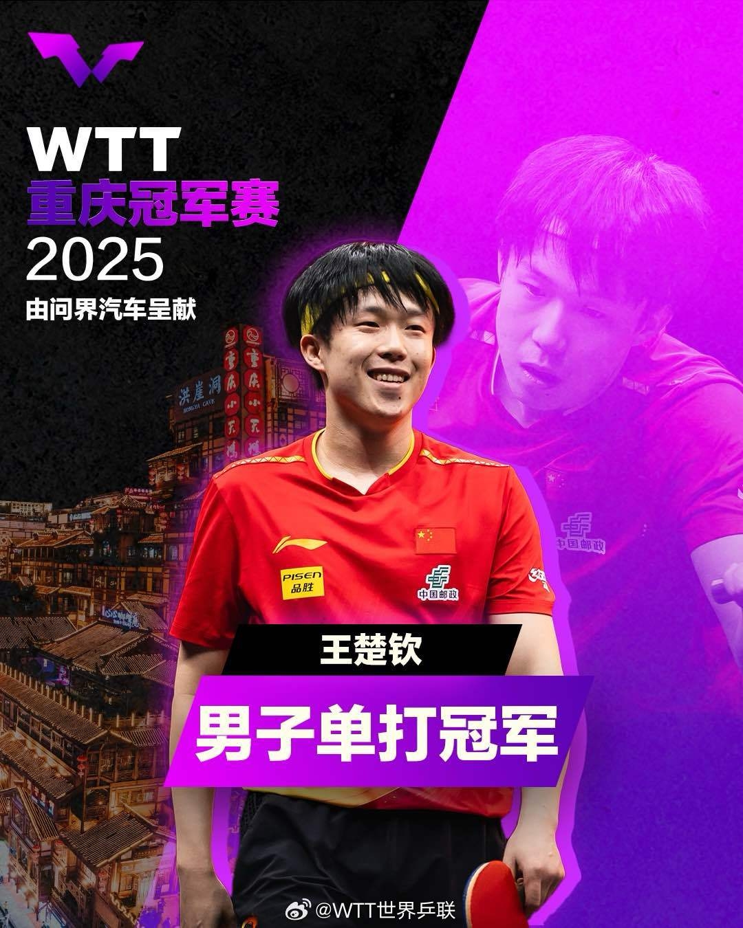 直播吧03月16日讯 WTT世乒联冠军赛重庆站男单决赛,王楚钦4-1击败林诗栋,成功夺冠!
