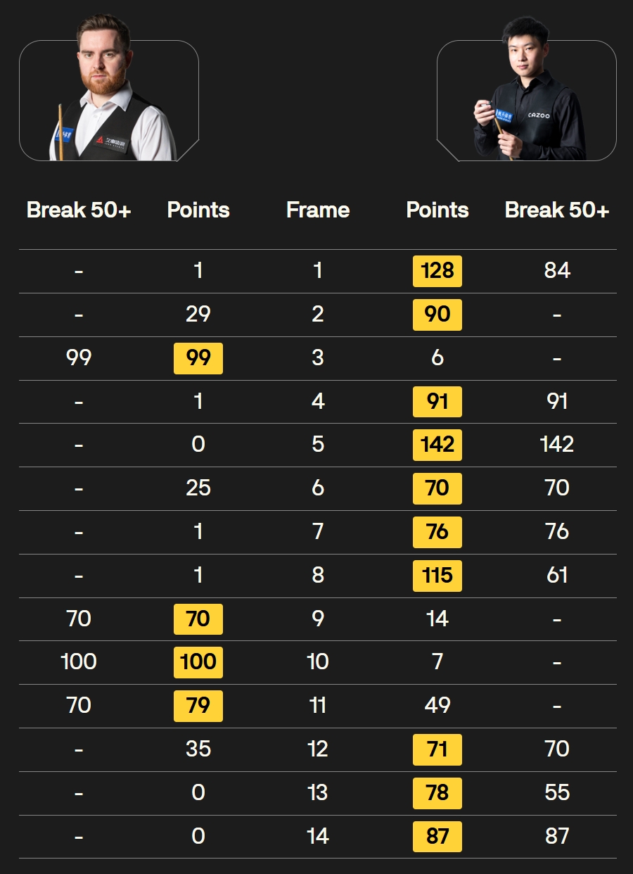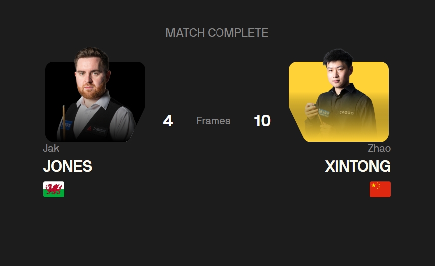 第一阶段结束后赵心童取得了7-2的领先,第二阶段开始后杰克-琼斯连扳两局,并先后打出单杆100分和70分,第12局赵心童打出单杆70分获胜,第13局赵心童打出单杆55分再胜一局率先拿到赛点,最后一局赵心童单杆87分收下比赛。