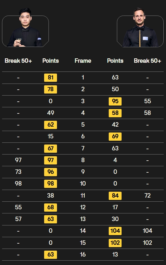 全场比赛斯佳辉打出五杆50+(97、73、98、55、57),大卫-吉尔伯特打出两杆破百(104、102)和三杆50+(55、58、72),第一阶段结束斯佳辉6-3领先大卫-吉尔伯特,第二阶段斯佳辉连续打出50+扩大比分,上半场结束率先到达赛点9-4领先大卫-吉尔伯特。
