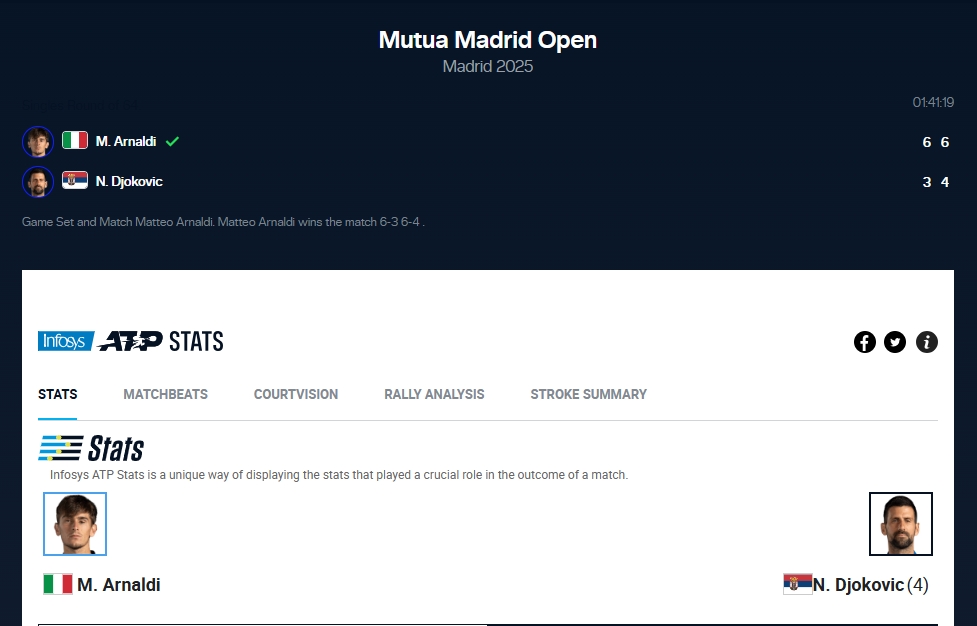 直播吧04月26日讯 马德里大师赛第二轮,3届赛会冠军、赛会4号种子德约科维奇对阵世界排名第44位的意大利选手阿纳尔迪。最终德约3-6、4-6不敌对手,首战即出局。