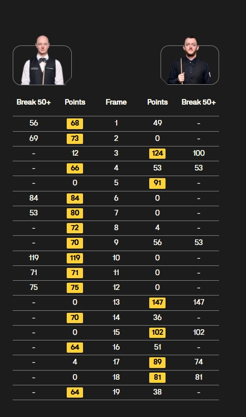第二阶段韦克林连胜将比分扩大至10-2,艾伦在第13局打出职业生涯第5杆147,韦克林随后率先到达赛点12-4领先艾伦。