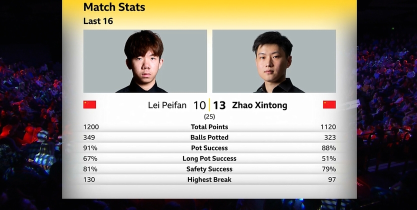 第三阶段开始,赵心童上来就单杆72分拿下一局,随后雷佩凡回敬单杆135分扳回一局,赵心童再下一局拿到赛点,雷佩凡顽强挽救3个赛点,将比分扳成12-10。第23局赵心童打出单杆54分获胜,13-10力克雷佩凡。