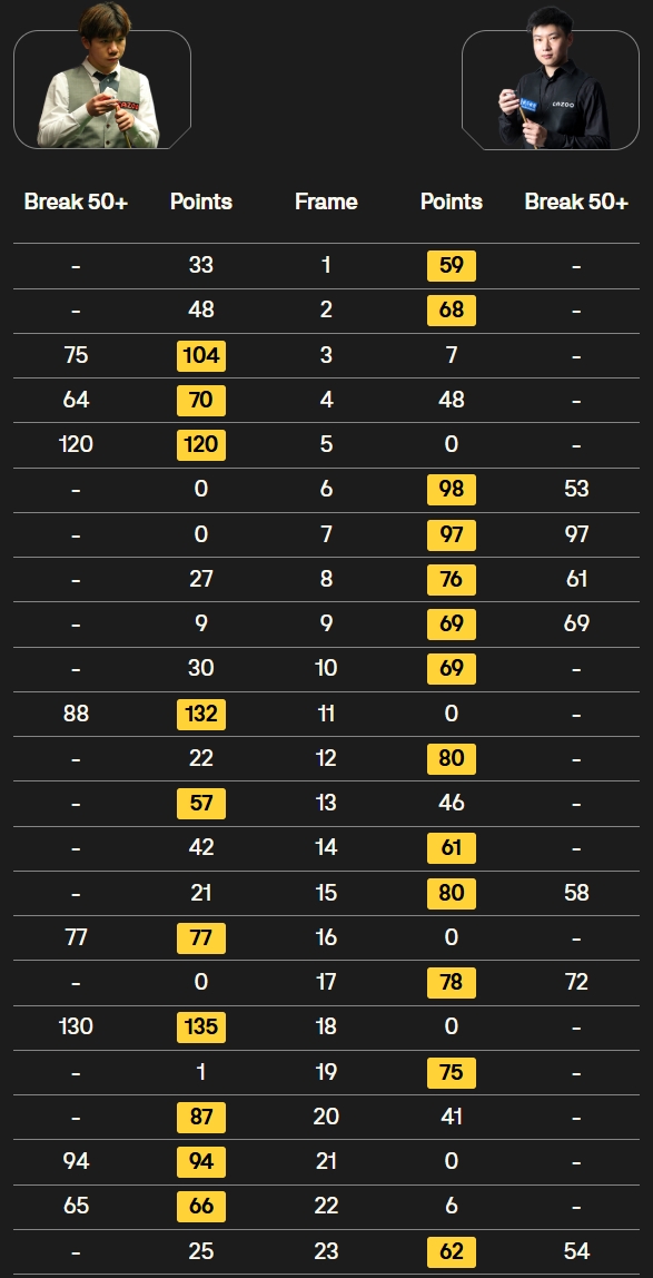 第一阶段中赵心童取得5-3领先,第二阶段赛事,双方总共打出3杆50+,赵心童再次打出5-3的比分,以10-6的比分进入第三阶段。