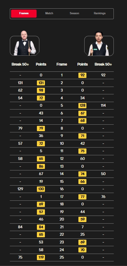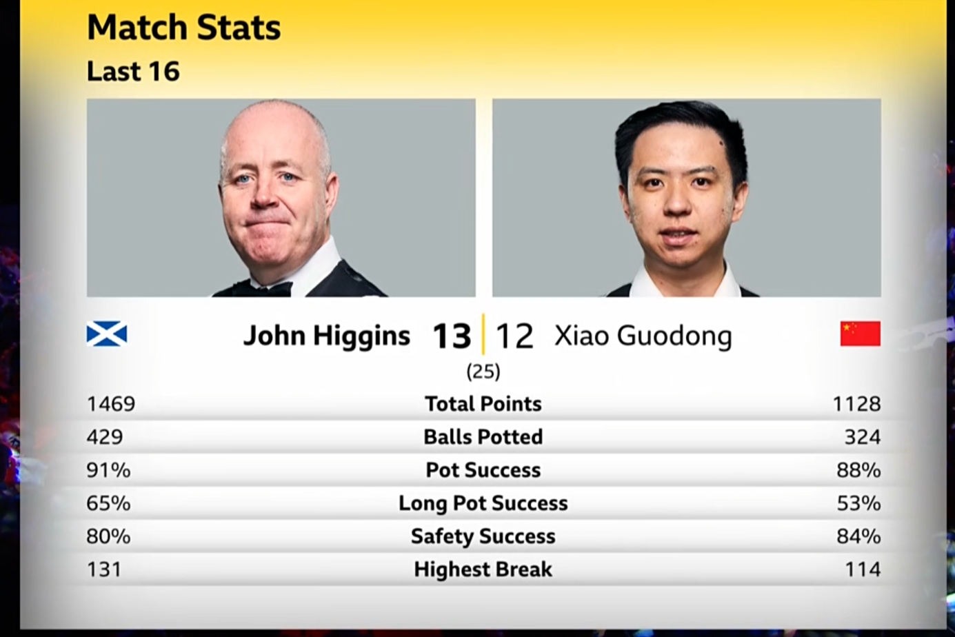 决胜局,希金斯凭借精彩防守导致肖国栋发生失误,随后希金斯一杆致胜拿下比赛,晋级8强,8强希金斯将面对老对手马克-威廉姆斯。