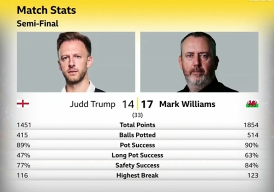 最终马克-威廉姆斯以17-14的比分战胜贾德-特鲁姆普晋级决赛,他将在决赛中对阵赵心童。