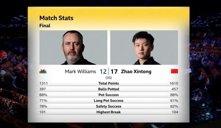 直播吧5月6日讯 斯诺克世锦赛决赛第四阶段,马克-威廉姆斯开局后连追四局,目前以12-17落后赵心童。