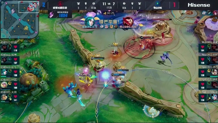 【17:20】AG带着三路龙兵推进,哪吒开大想要反打但是直接被张良大招阻止,随后AG直接开始反打,AG成功打赢团战拿下胜利!