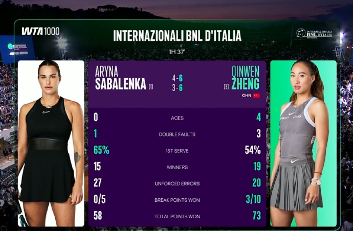 直播吧5月15日讯 WTA1000罗马站1/4决赛,郑钦文6-4、6-3战胜世界第一萨巴伦卡,首进罗马站四强,这也是郑钦文生涯首次战胜萨巴伦卡,同时也是本赛季郑钦文首次杀进巡回赛四强。