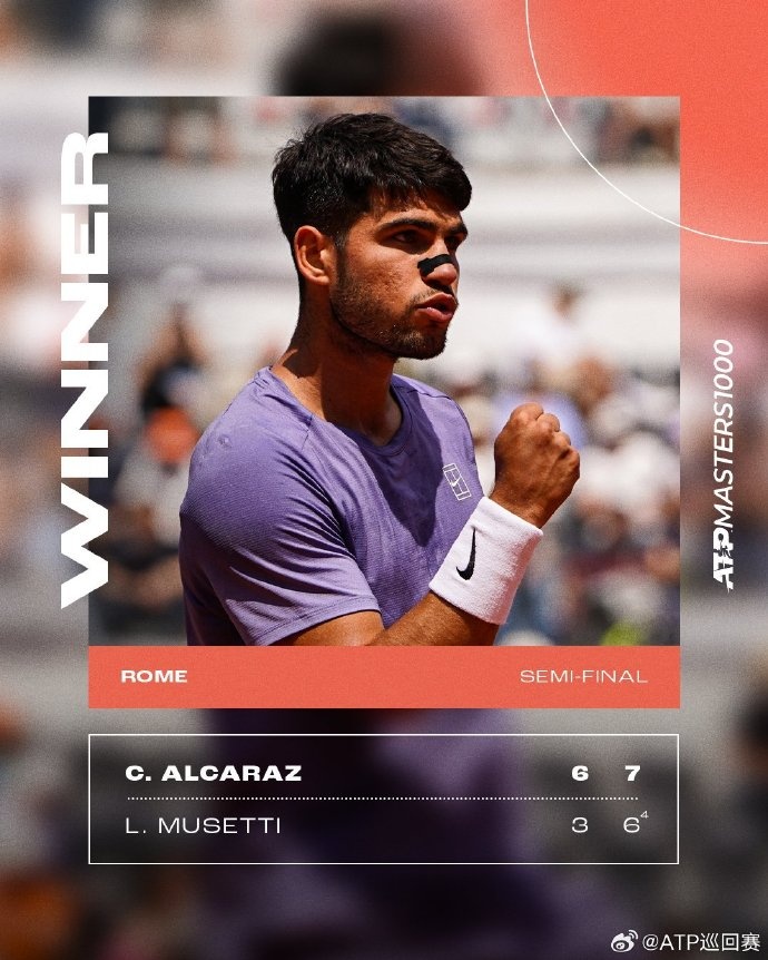 阿尔卡拉斯取得对穆塞蒂的五连胜,生涯第25次闯入巡回赛决赛,第8次闯入大师赛决赛。