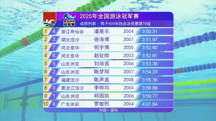进决赛!全国游泳冠军赛男子400自预赛,潘展乐3分50秒31小组第1