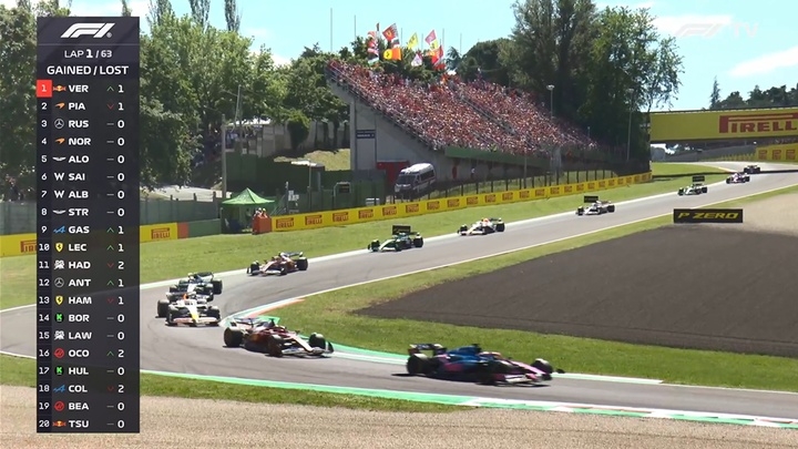1/63 五盏红灯熄灭,维斯塔潘S弯走外线强势上到P1,勒克莱尔上到P10,汉密尔顿掉到P13,哈贾尔掉到P11,安东内利