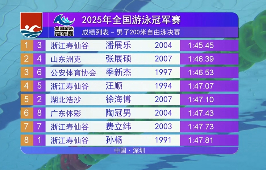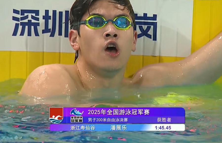 直播吧05月19日讯 2025年全国游泳冠军赛男子200米自由泳决赛在深圳大运中心游泳馆进行,多位游泳名将同场竞技。最终潘展乐以1分45秒45的成绩夺金,包揽200米&400米自由泳金牌。