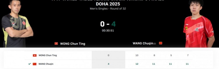 四局比分分别为:12-10、11-6、11-5、11-7。整场比赛耗时31分钟,王楚钦没有遇到太大挑战。