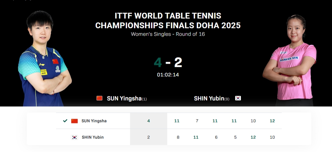 6局比分分别为11-8、7-11、11-6、11-5、10-12、12-10。孙颖莎第六局一度6-10落后,最终连拿6分赢得比赛,下轮将对阵日本选手大藤沙月。