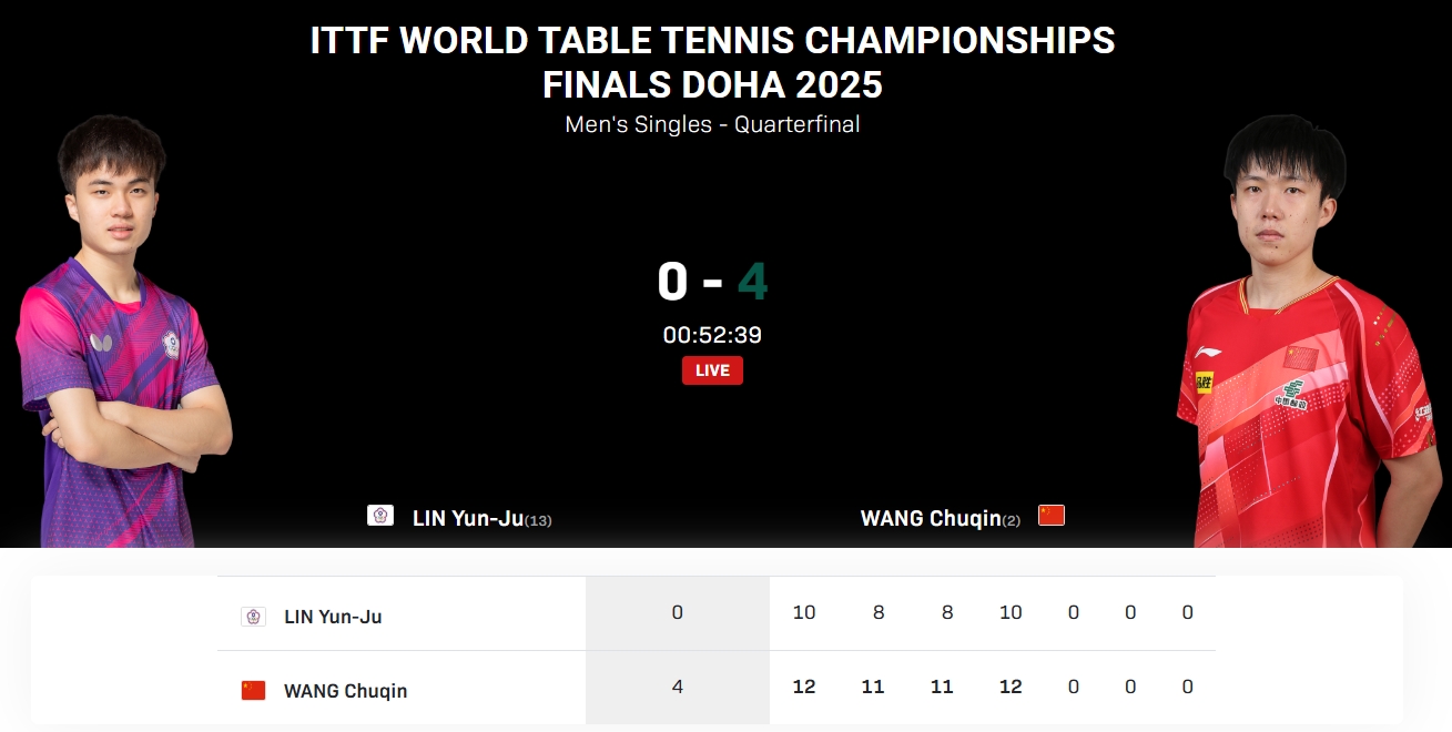四局比分分别为:12-10、11-8、11-8、12-10。半决赛中王楚钦将对阵莫雷加德和户上隼辅的胜者。另一组半决赛中,梁靖崑将对阵安宰贤和雨果的胜者。