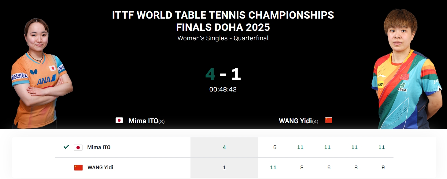 直播吧05月23日讯 世乒赛女单1/4决赛,世界排名第4的王艺迪,对阵世界排名第9的伊藤美诚,最终王艺迪1-4不敌对手,止步世乒赛8强。