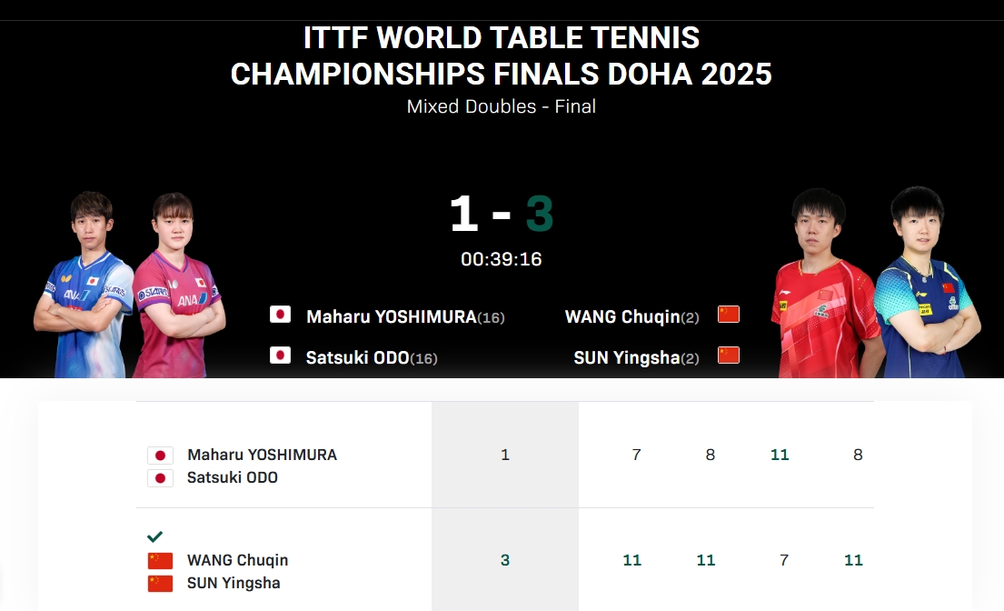此前在2021年休斯敦世乒赛与2023年德班世乒赛上,王楚钦/孙颖莎实现世乒赛混双两连冠,他们还是2024年巴黎奥运会混双金牌得主。