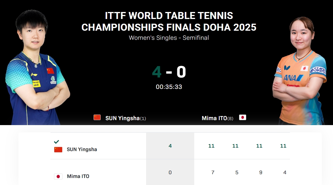 直播吧05月24日讯 多哈世乒赛女单半决赛,世界第一的孙颖莎对阵世界第九伊藤美诚,最终孙颖莎取胜晋级女单决赛。决赛将战王曼昱vs陈幸同胜者。