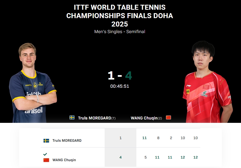 决赛王楚钦将对阵雨果与梁靖崑之间的胜者,另一场半决赛将于北京时间今日22点40进行。