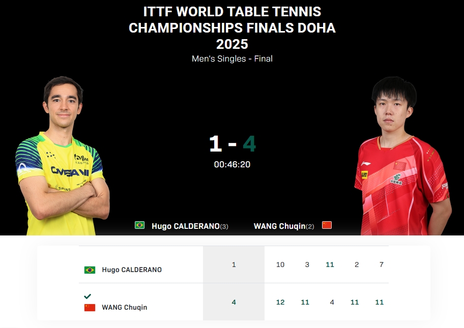 直播吧05月25日讯 世乒赛男单决赛,世界排名第2的王楚钦,对阵新科世界杯冠军、世界排名第3的巴西选手雨果。最终王楚钦4-1击败对手,首次夺得世乒赛男单冠军,这也是王楚钦个人三大赛(奥运会、世乒赛、世界杯)单打首冠!王楚钦也报了世界杯半决赛输球的一箭之仇。国乒自2005年世乒赛后,连续11届拿下男单冠军。