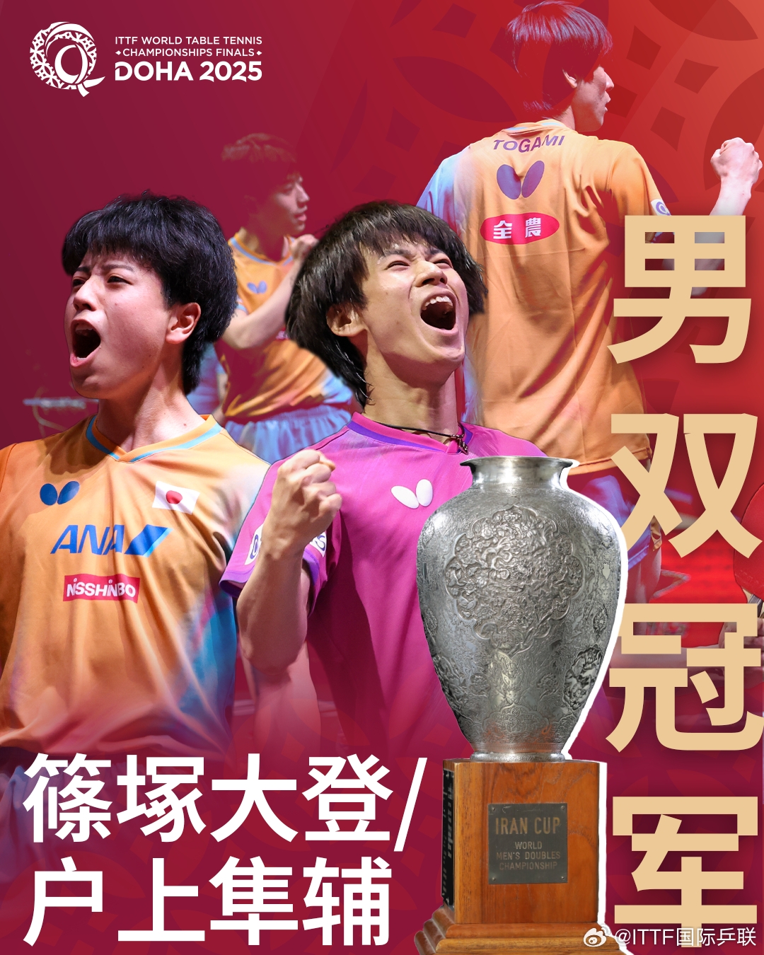 直播吧05月25日讯 多哈世乒赛男双决赛,世界排名第11的中国台北组合林昀儒/高承睿,对阵世界排名第5的日本组合户上隼辅/篠塚大登。最终户上隼辅/篠塚大登3-2力克对手,首次夺得世乒赛男双冠军。