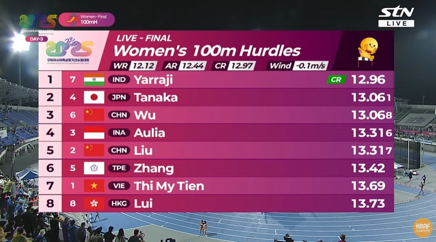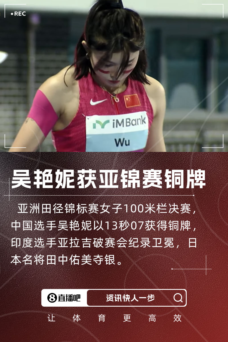 直播吧05月29日讯 2025亚洲田径锦标赛在韩国举行,女子100米栏决赛,中国选手吴艳妮在第6道出战,另一名中国选手刘景扬在2道。最终印度选手、卫冕冠军亚拉吉以12秒96夺金,并刷新赛会纪录。日本选手田中佑美以13秒07摘银,吴艳妮以千分之七秒之差获得铜牌,另一名中国选手刘景扬获得第5。