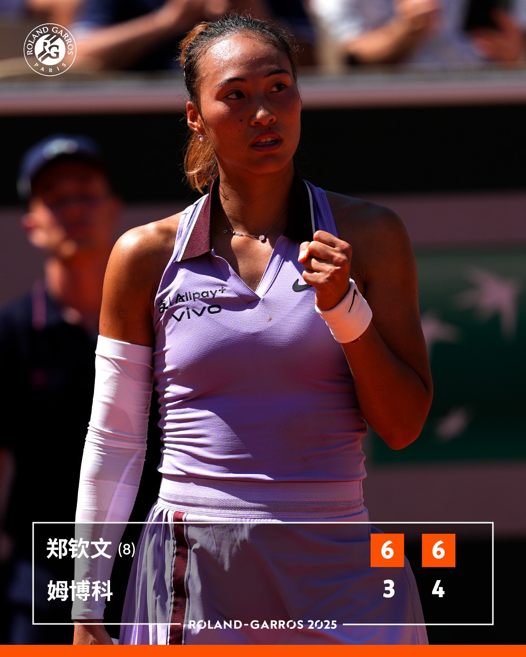 直播吧05月30日讯 法网女单第3轮,赛会8号种子郑钦文直落两盘击败加拿大新星姆博科,挺进法网16强!