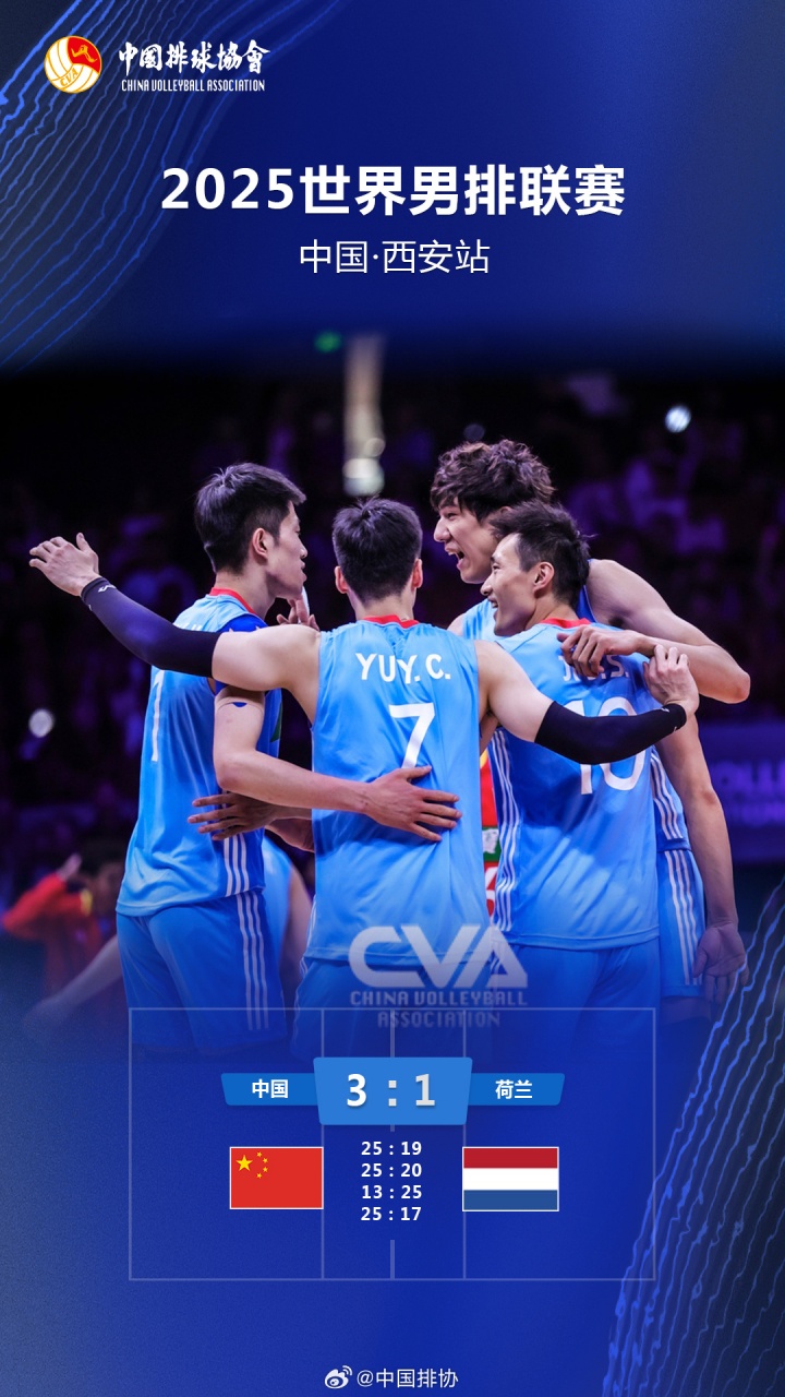 直播吧06月14日讯 世界男排联赛西安站,世界排名第20位的中国男排对阵世界排名第14位的荷兰男排,最终中国男排3-1(25-19/25-20/13-25/25-17)击败荷兰男排,取得两连胜!