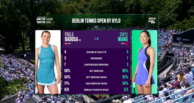 直播吧06月20日讯 WTA500柏林站1/4决赛,王欣瑜对阵世界排名第10的巴多萨,首盘比赛,王欣瑜3度完成破发,6-1完成速胜!大比分1-0领先!