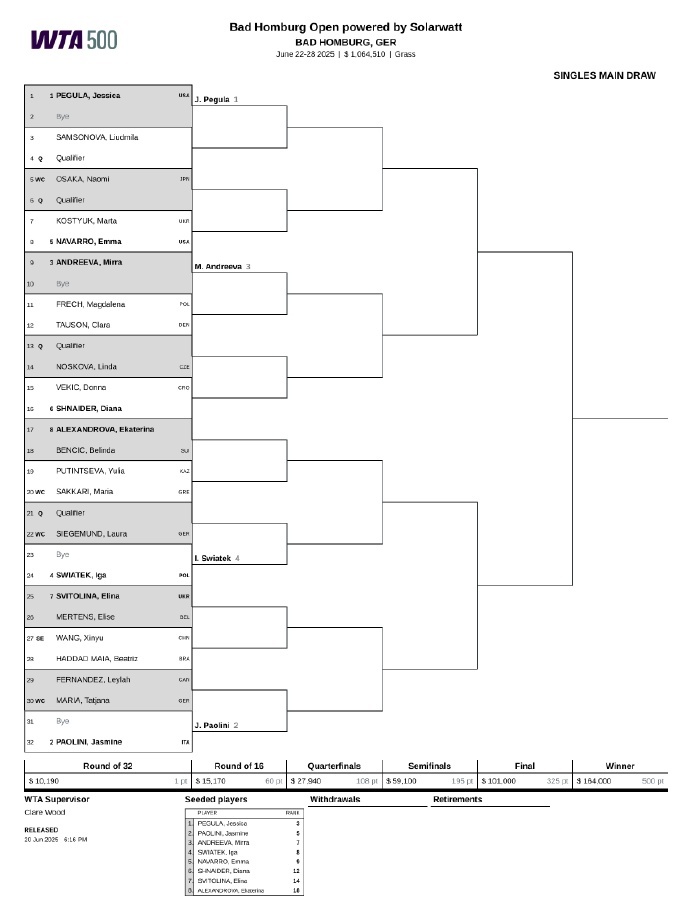 佩古拉、鲍里妮、米拉-安德列娃、斯瓦泰克作为前四种子出战。