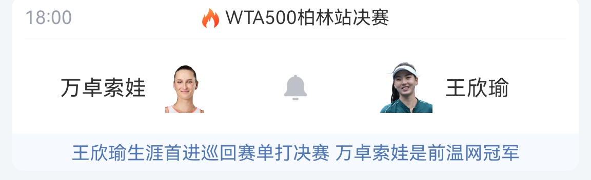 直播吧06月21日讯 WTA500柏林站半决赛,王欣瑜2-0淘汰萨姆索诺娃,另一场半决赛2-0淘汰世界第一萨巴伦卡。