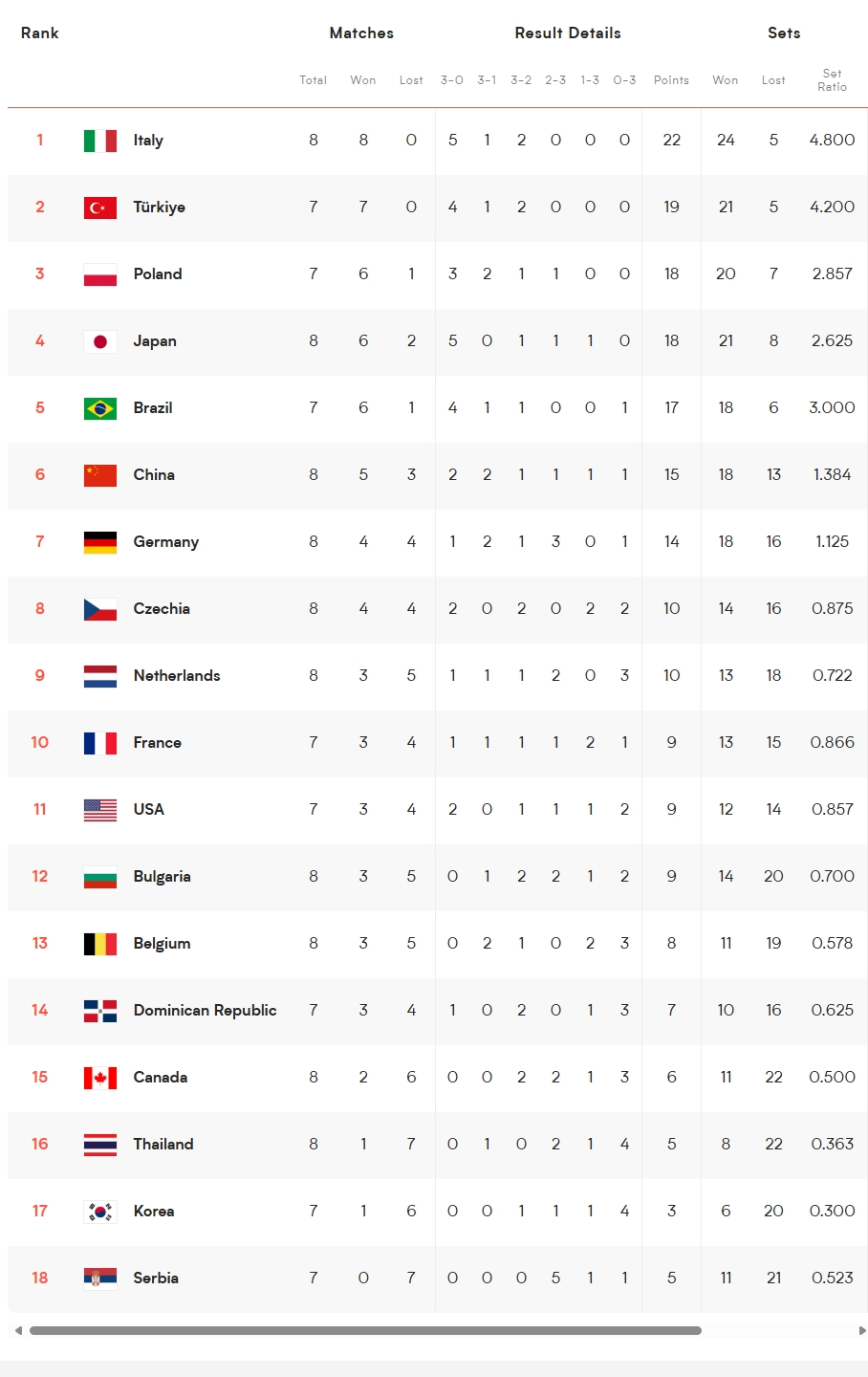 世界女排联赛积分榜↓