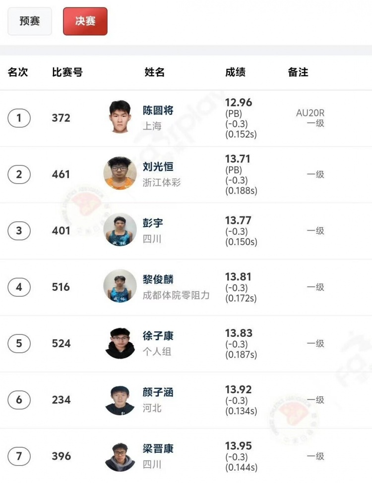 陈圆将成为历史上第二位打开13秒大关的青年选手。