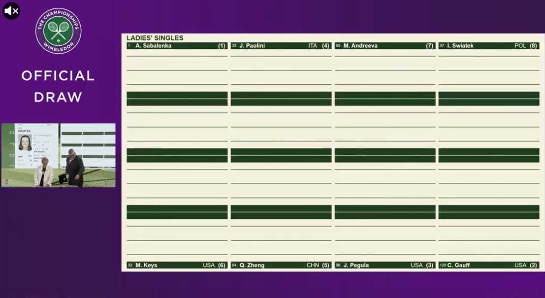 直播吧06月27日讯 温网女单抽签8强种子落位,郑钦文与保利尼同1/4区,与萨巴伦卡同在上半区。具体对阵仍在抽签……