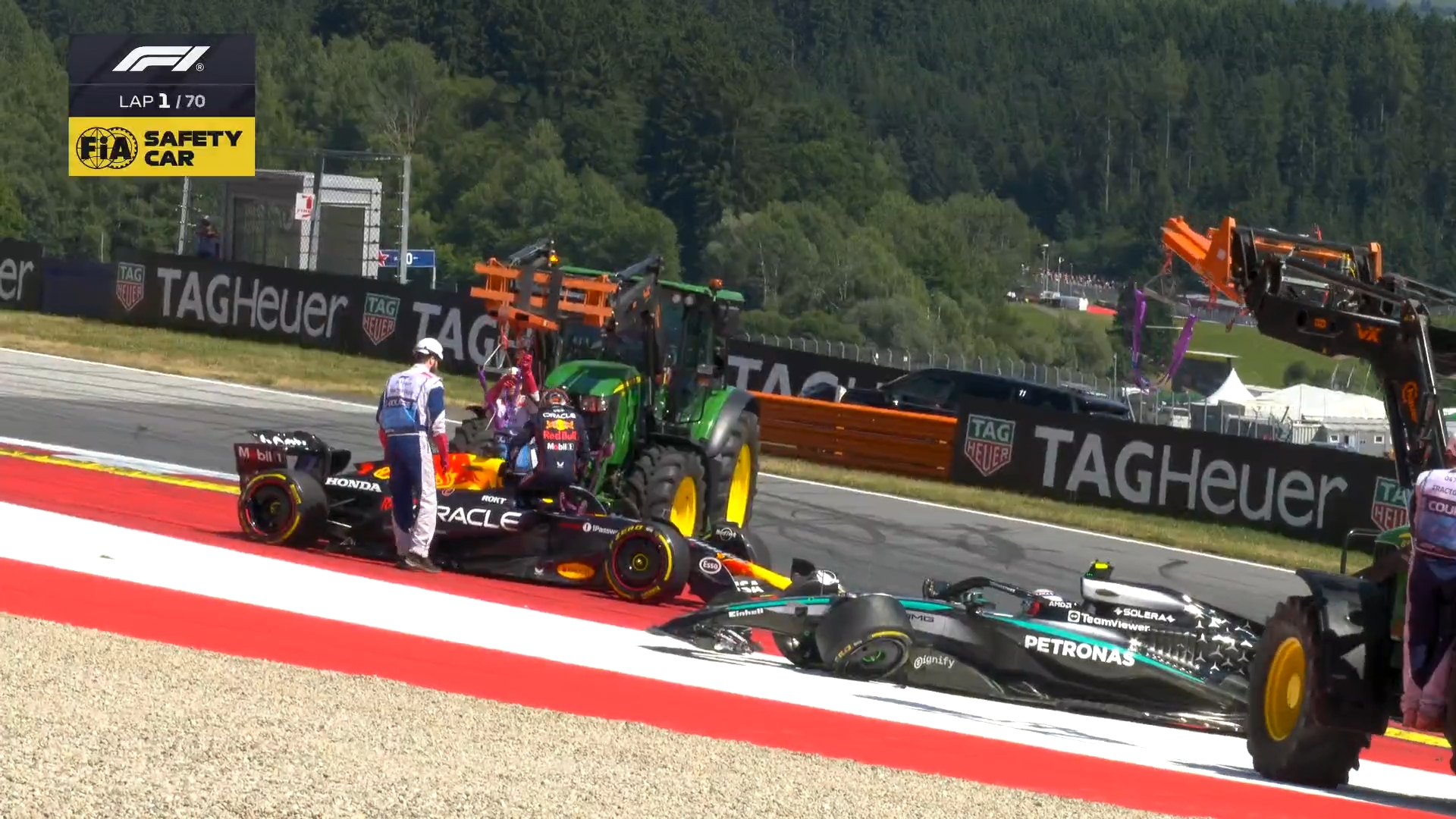 比赛第1圈,安东内利锁死,径直撞上维斯塔潘,两车双双退赛↓