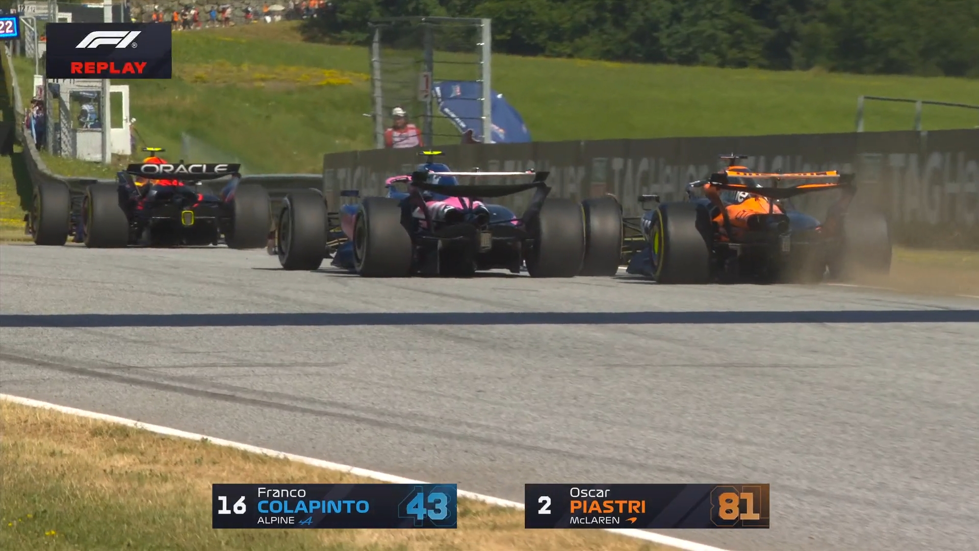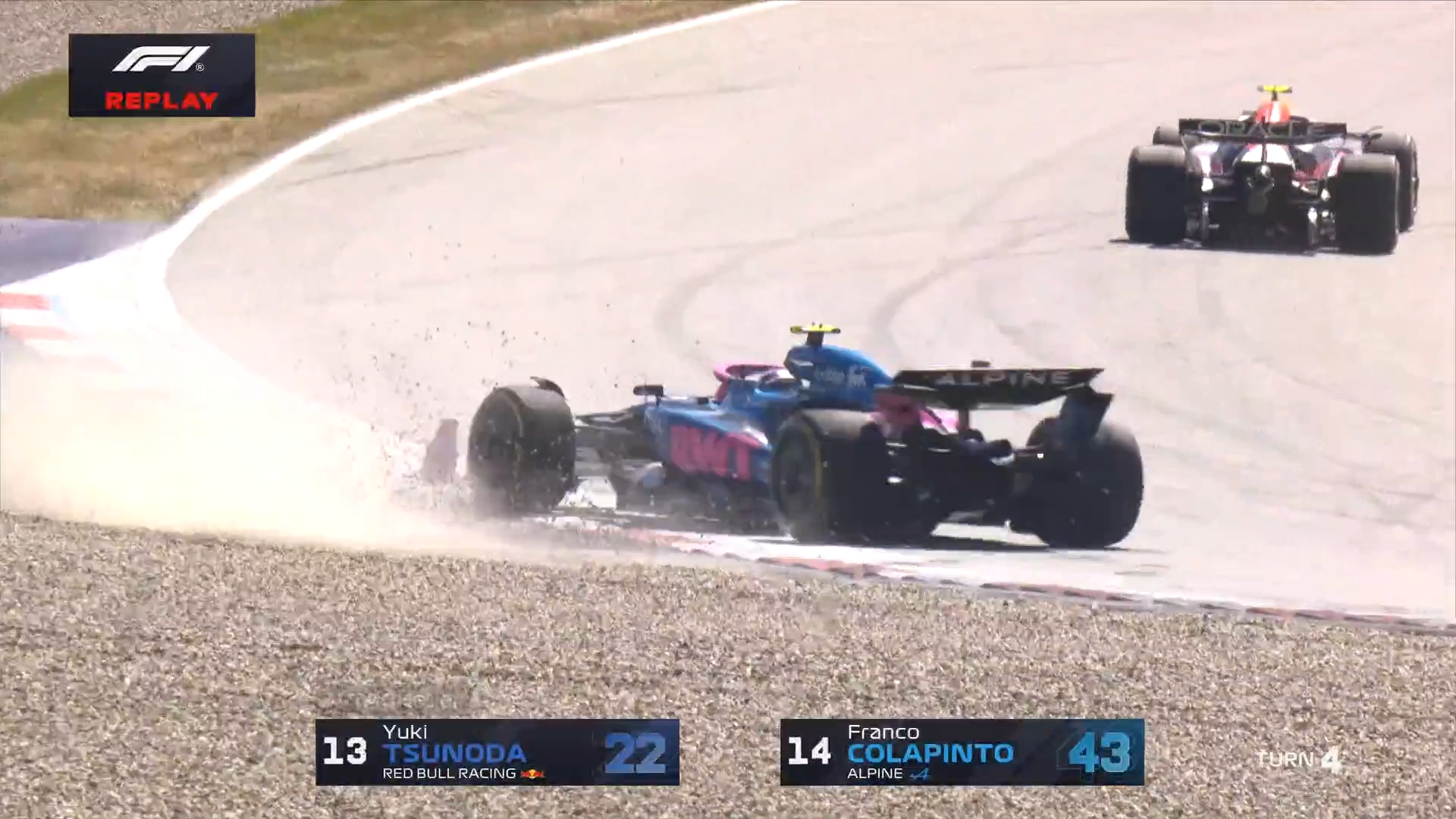 角田裕毅和科拉平托碰撞,后者旋转一周后继续前进,角田进站更换前翼,随后被罚时10秒↓