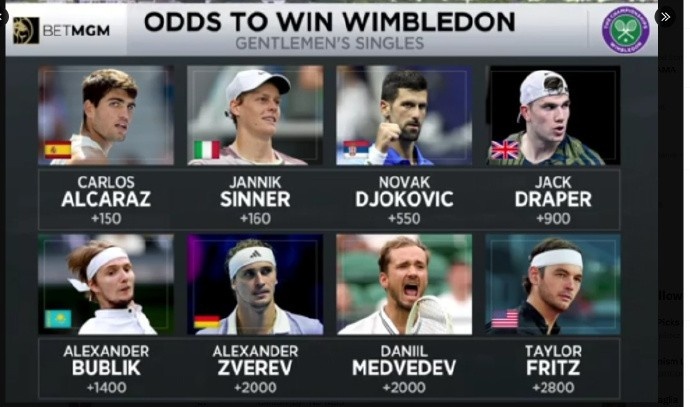直播吧6月30日讯 温网今天将展开争夺,在男单夺冠赔率榜上,阿尔卡拉斯排名第一,辛纳排名第二,德约科维奇排名第三,小兹维列夫排名第六。